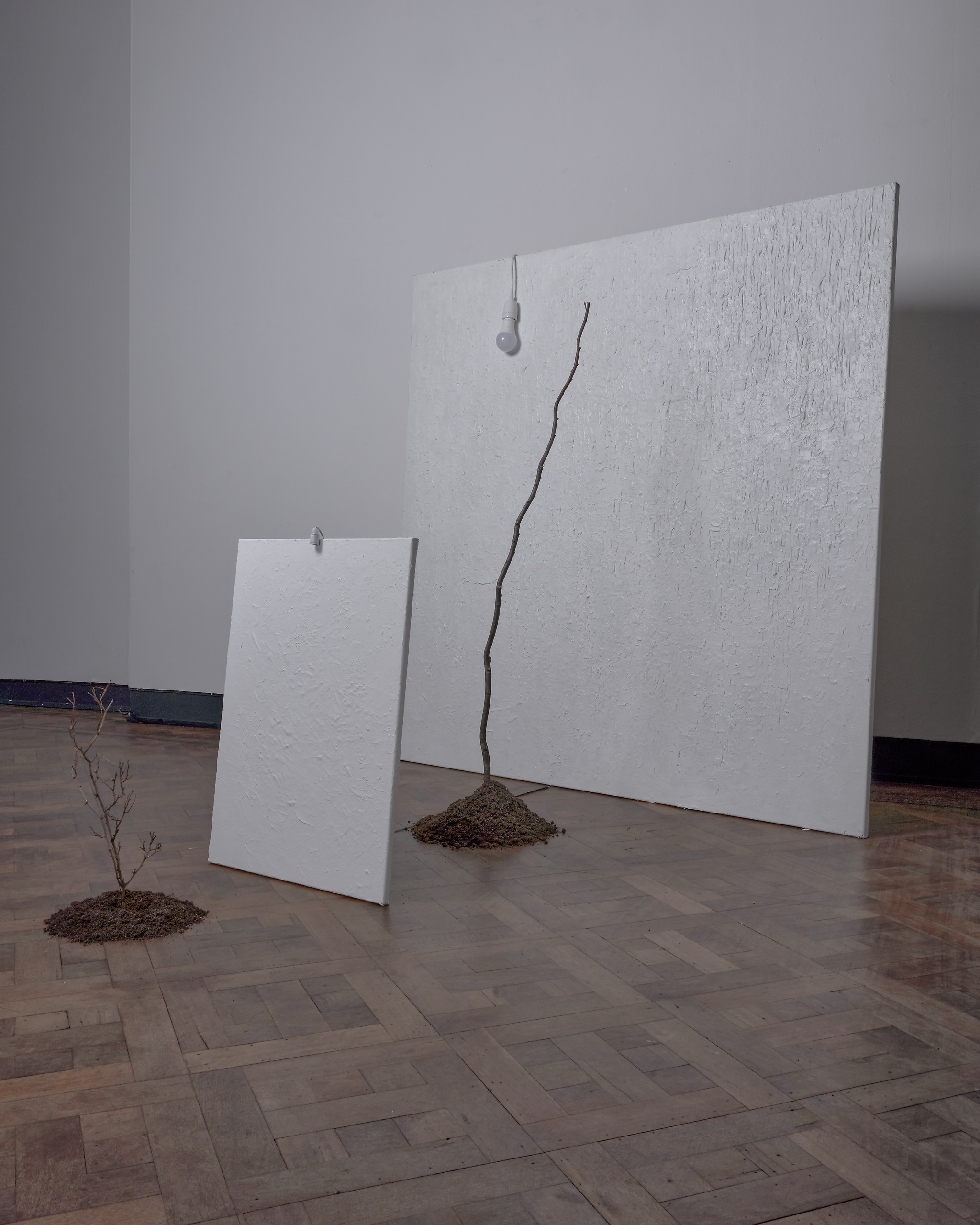 The artist redefines the void through artworks employing light, darkness, and tree bark. The bark plays important roles in trees, including protection and hydration. The bark of a tree is dead, but at the same time it is alive. Illuminated tree bark casts shadows, accentuating its contours. This metaphor, reflected in the title, underscores the interdependence of nothingness and existence, similar to the symbiosis of light and darkness.